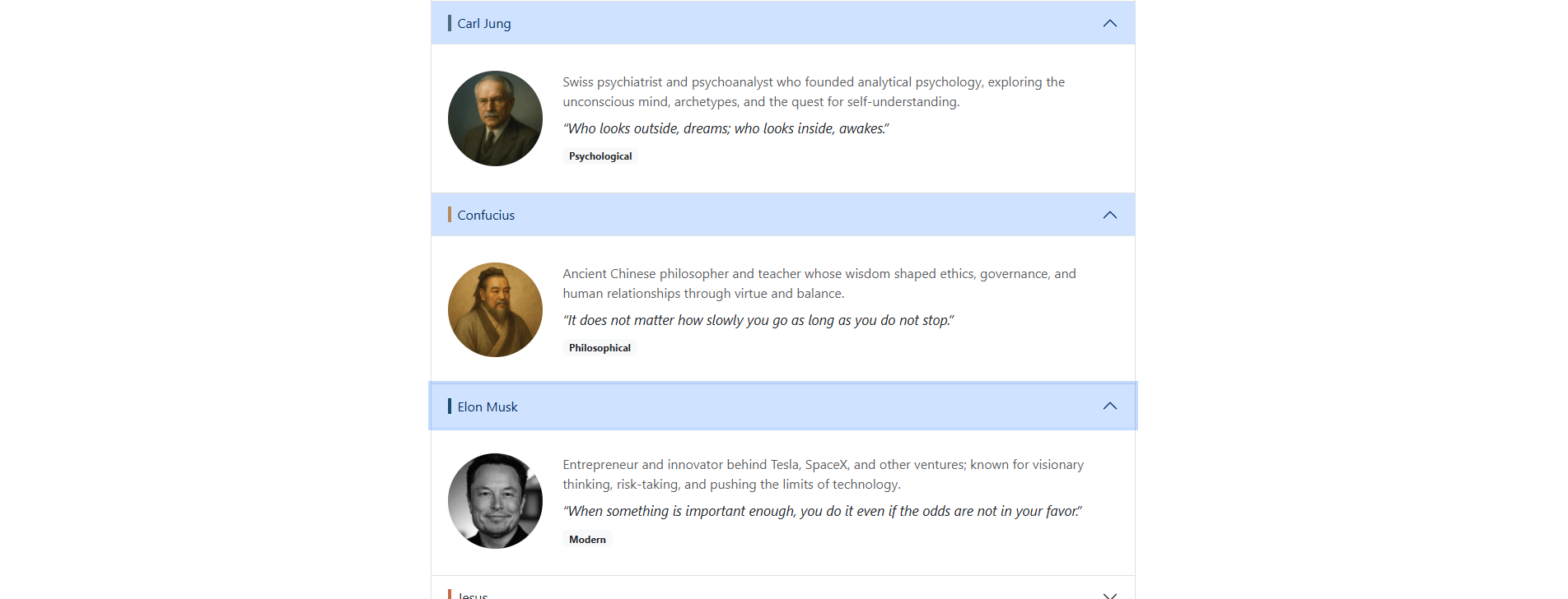 Each response is meticulously crafted by state-of-the-art artificial intelligence to simulate the unique style, values, and core wisdom of the chosen historical figure, providing a deeply personalized and reflective experience.