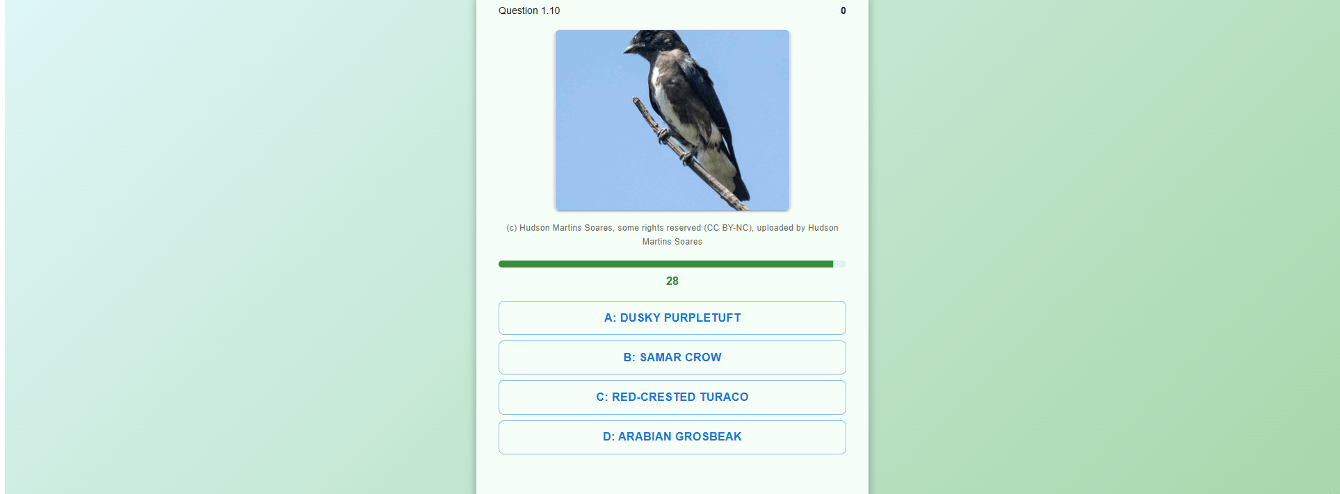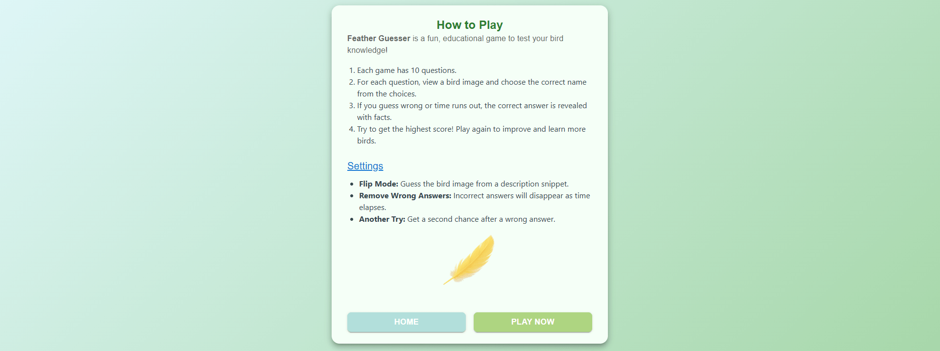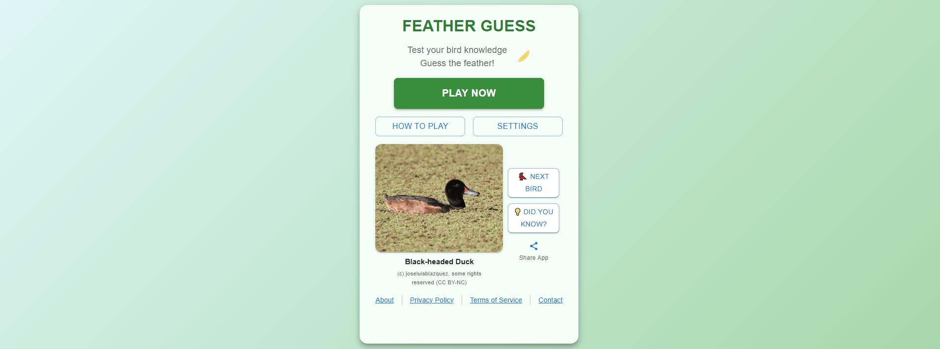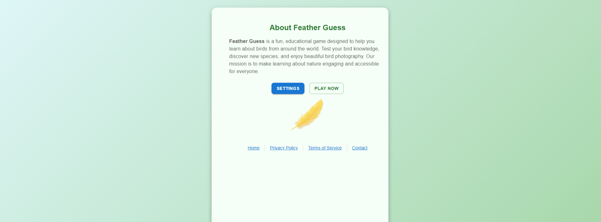 Feather Guess is a fun, educational game designed to help you learn about birds from around the world. Test your bird knowledge, discover new species, and enjoy beautiful bird photography. Our mission is to make learning about nature engaging and accessible for everyone.