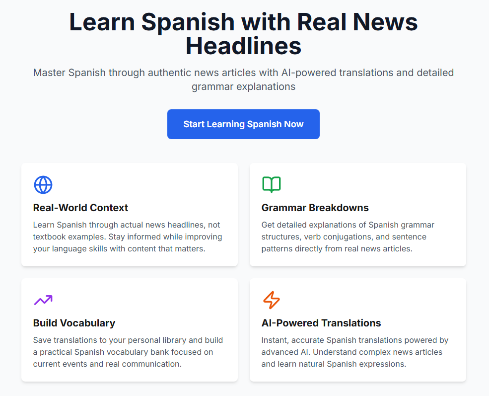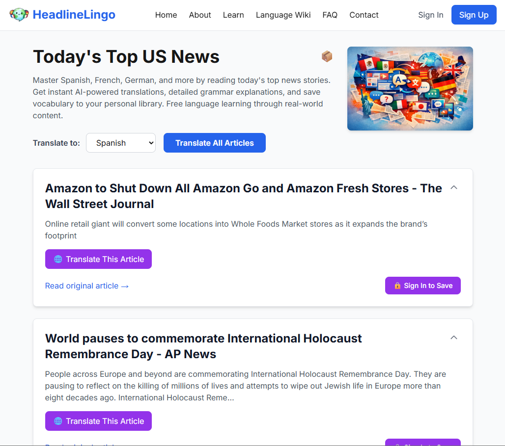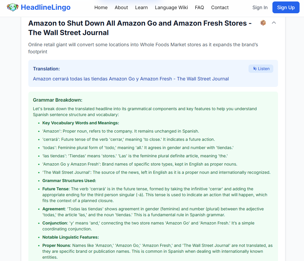 Every day, we fetch the top US news headlines and use advanced AI technology to translate them into 12 different languages. But we don’t stop at simple translation—each headline comes with a detailed grammar breakdown that explains: