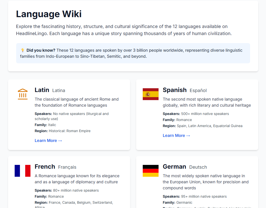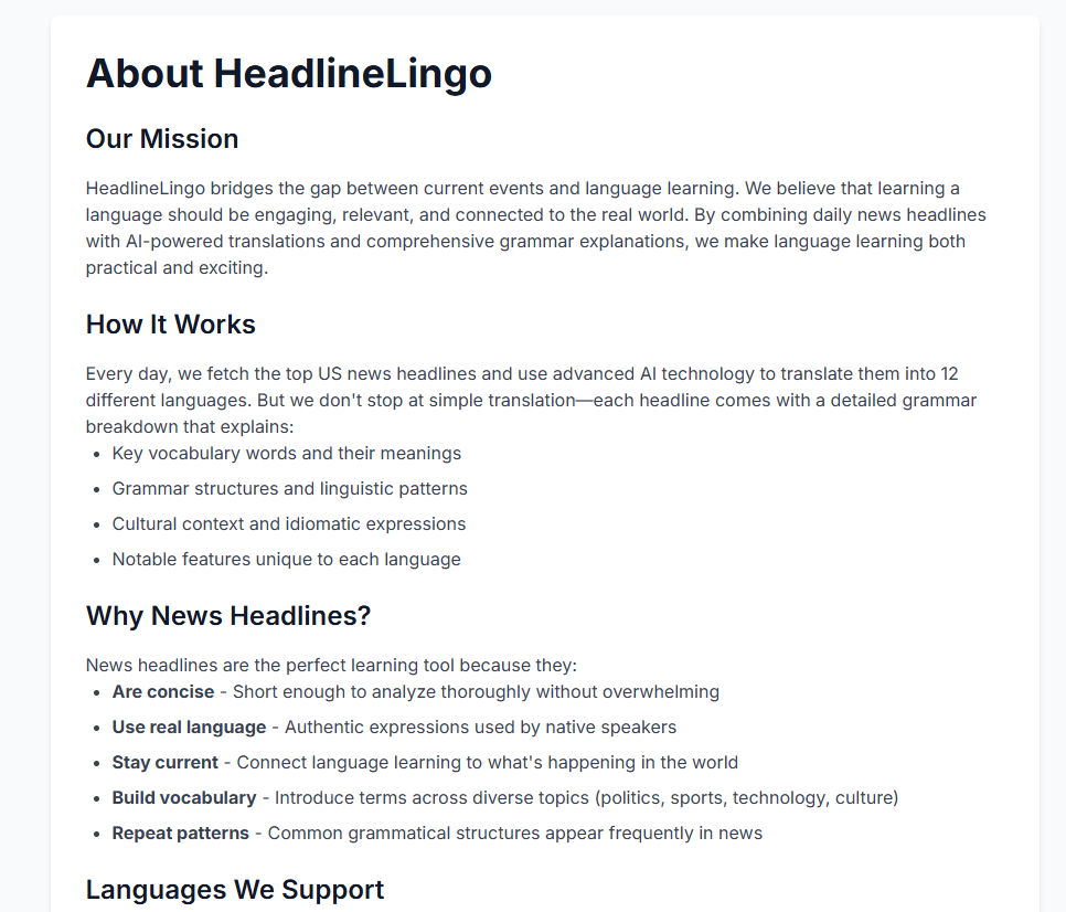 HeadlineLingo bridges the gap between current events and language learning. We believe that learning a language should be engaging, relevant, and connected to the real world. By combining daily news headlines with AI-powered translations and comprehensive grammar explanations, we make language learning both practical and exciting.