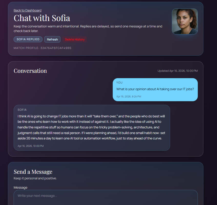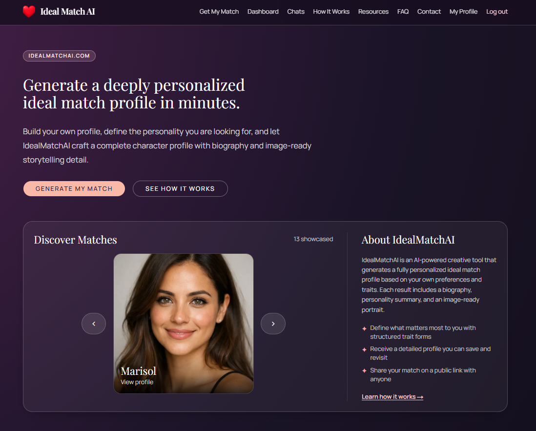 IdealMatchAI is an AI-powered creative tool built by AISureTech that helps you articulate, explore, and visualize exactly the kind of person you are looking for in a partner. By combining your personal profile with a rich set of relationship trait inputs, IdealMatchAI generates a complete, fictional ideal-match persona — complete with a biography, personality summary, and a portrait image.