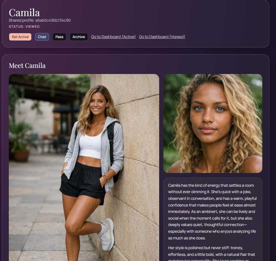 Navigate to the Generate page and fill in the trait form. Required fields cover core qualities; optional fields let you add deeper nuance. Once submitted, the AI assembles and returns a complete match persona — usually within a few seconds.