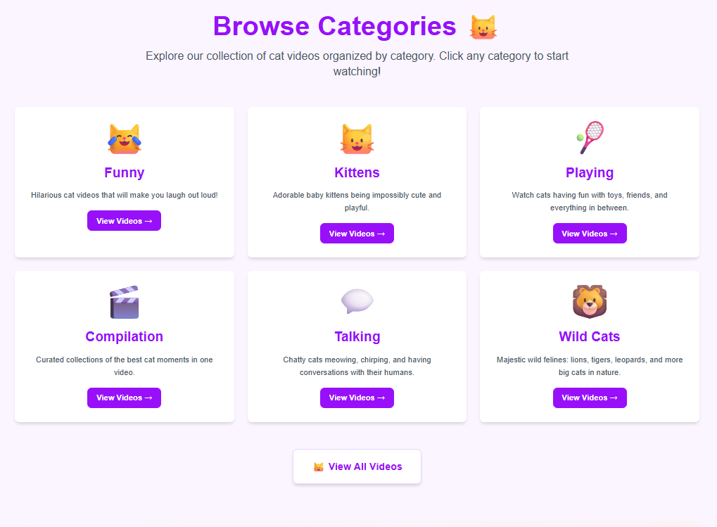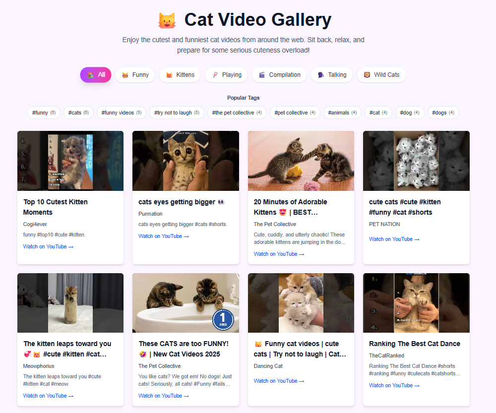 We scour YouTube to bring you the funniest, cutest, and most heartwarming cat videos. Every video is carefully selected to ensure you get the best content without having to search for hours.