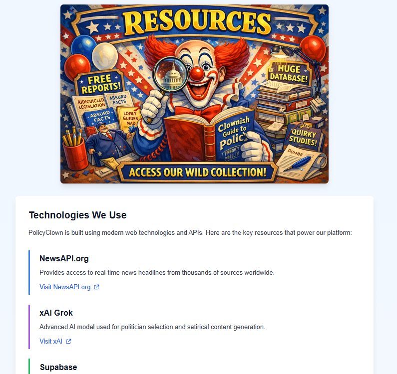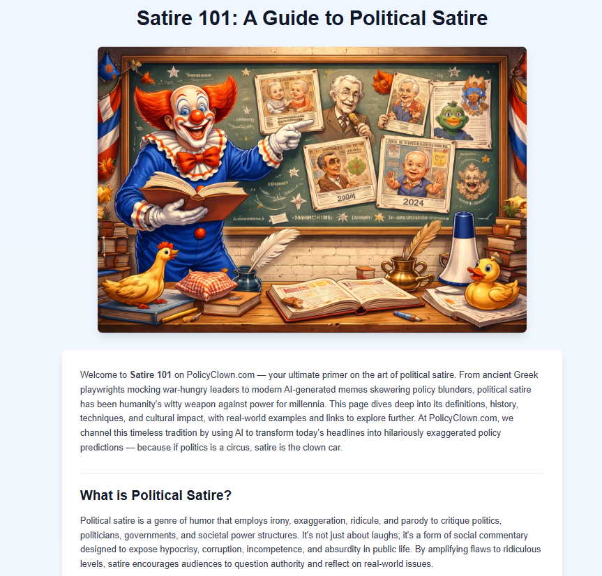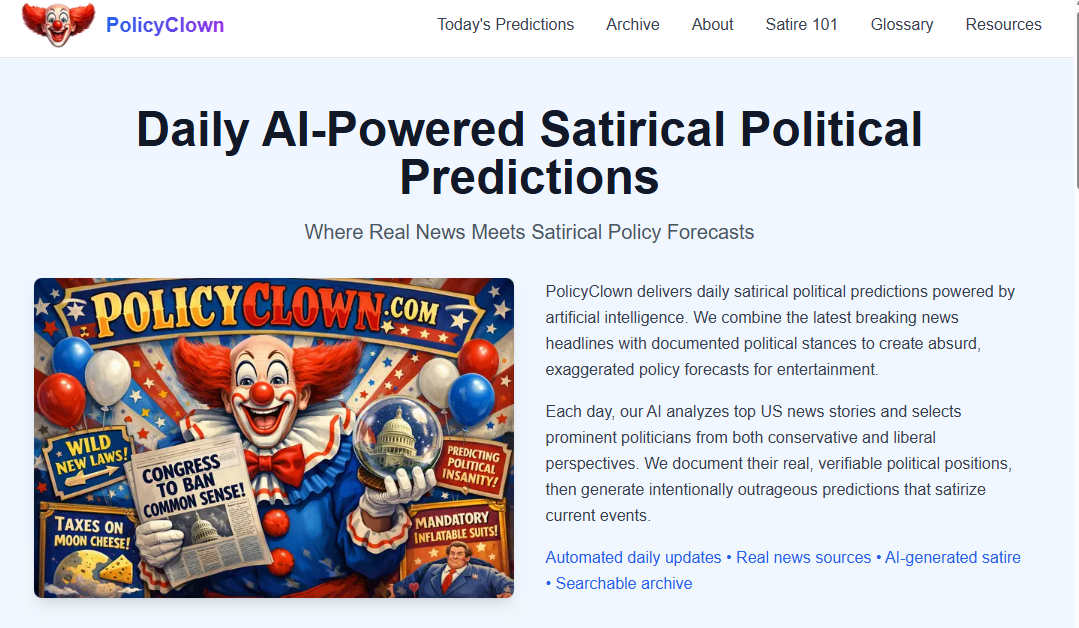 PolicyClown delivers daily satirical political predictions powered by artificial intelligence. We combine the latest breaking news headlines with documented political stances to create absurd, exaggerated policy forecasts for entertainment.