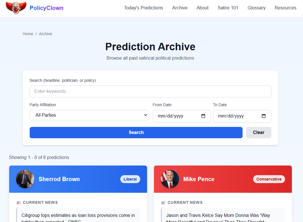 Each day, our AI analyzes top US news stories and selects prominent politicians from both conservative and liberal perspectives. We document their real, verifiable political positions, then generate intentionally outrageous predictions that satirize current events.