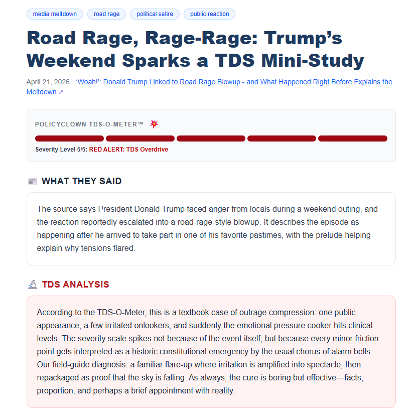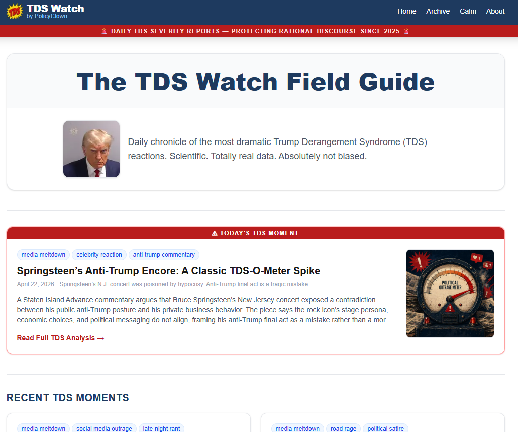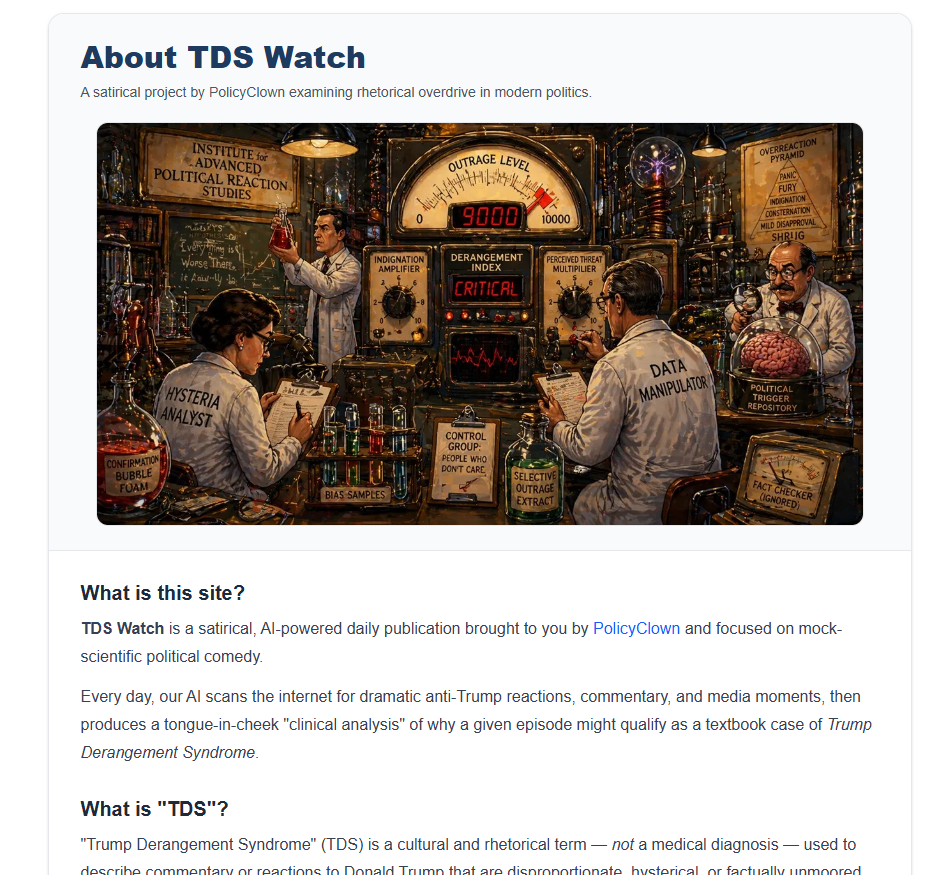 Satirical. Exaggerated. Mock-scientific. We deploy tools like the TDS-O-Meter™ and the PolicyClown Severity Scale to quantify the unquantifiable. Everything here is editorial opinion, not news reporting.